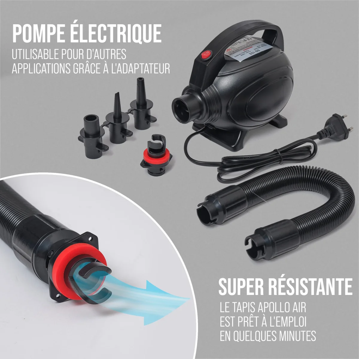 • Pompe électrique pour un gonflage et une aspiration d’air faciles