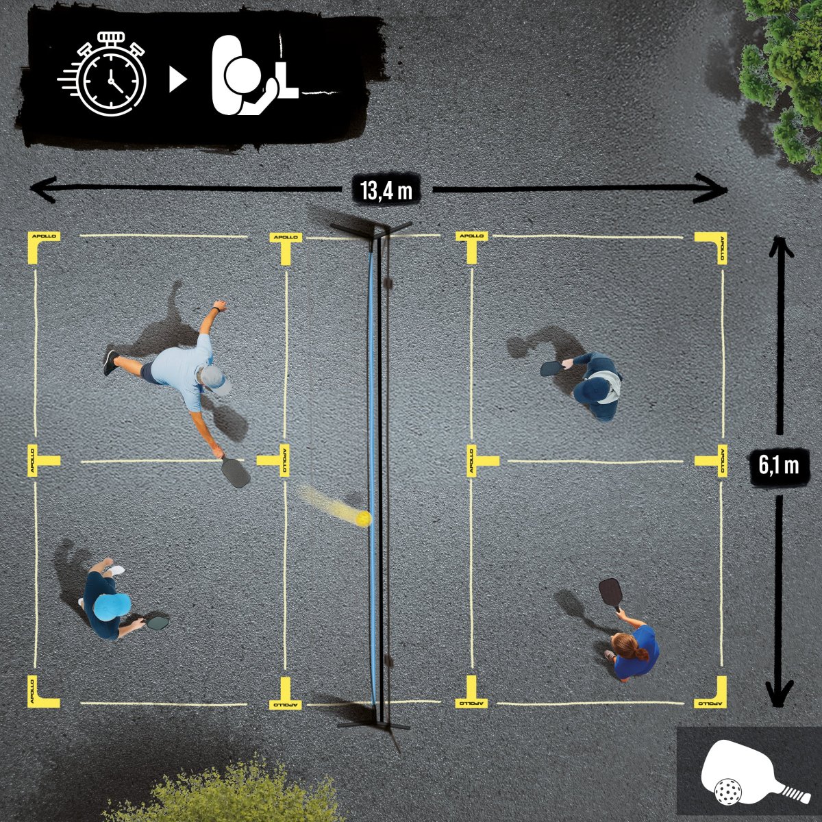 Avec le kit Apollo Pickleball Court Marker, vous aurez votre terrain idéal prêt en un rien de temps – quel que soit le sport !