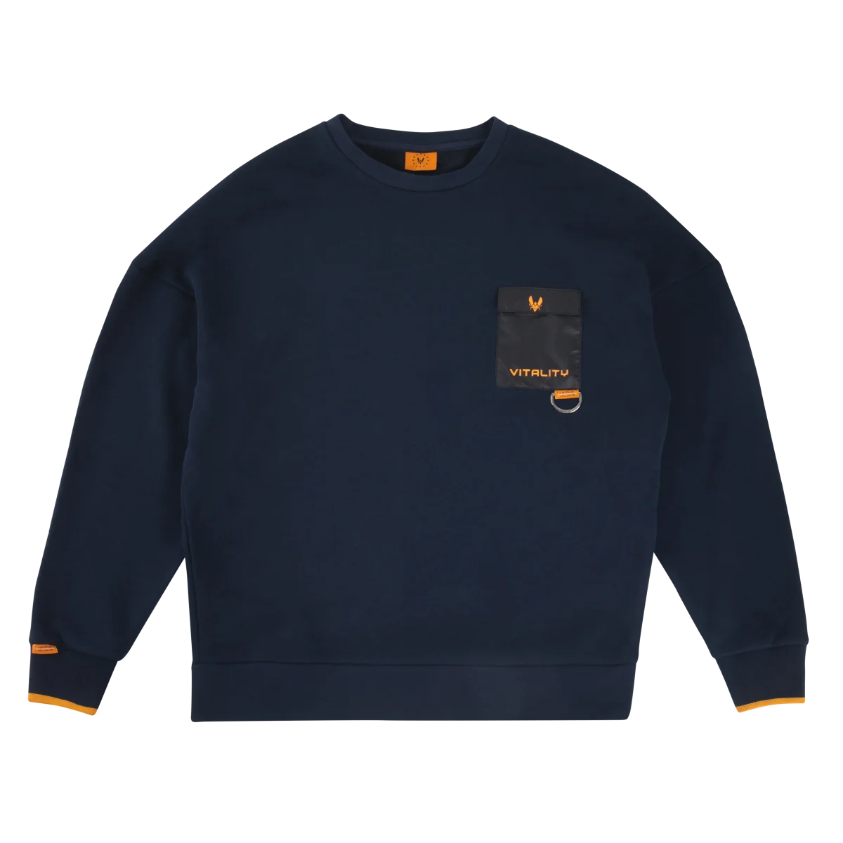 Crewneck Watch Us bleu foncé : crewneck esports oversize 100 % coton, poche noire contrastée, bande orange & patch Watch Us Follow Us, style streetwear Team Vitality.