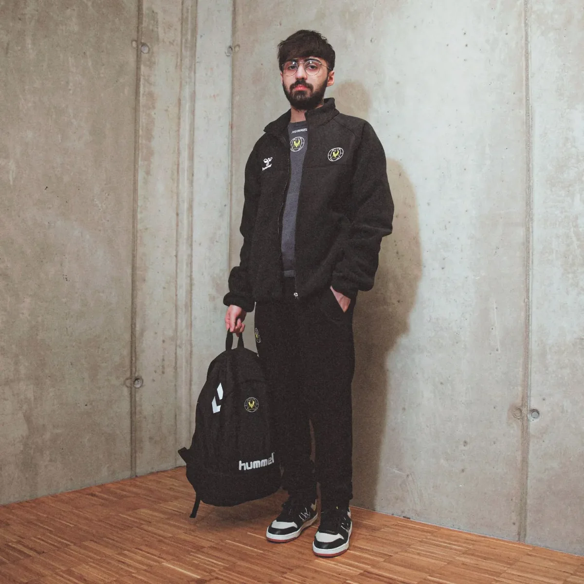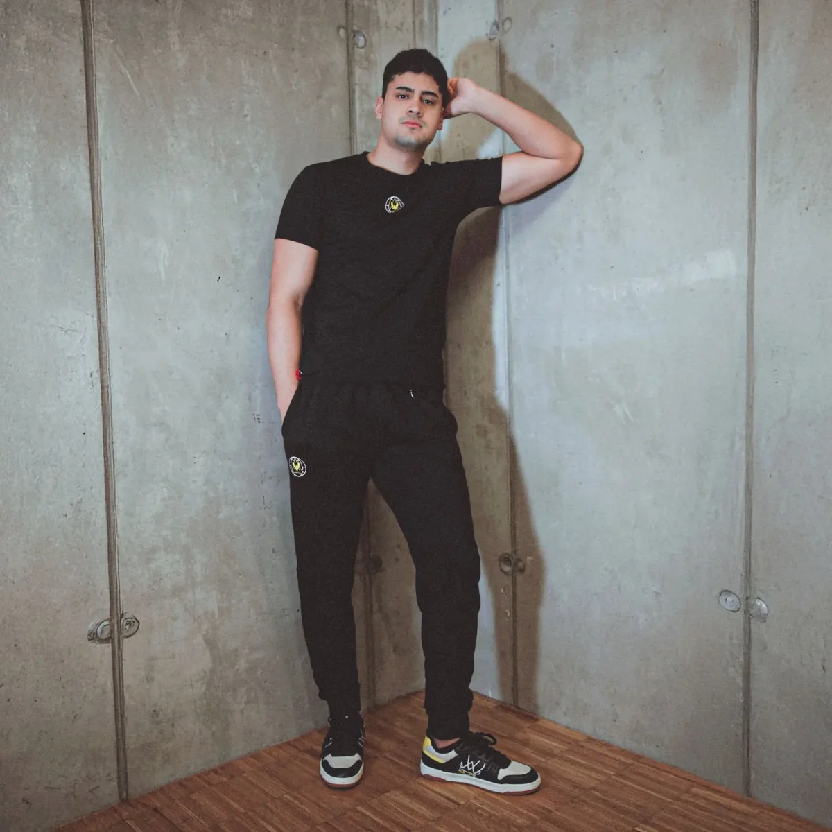 Un badge avec notre logo en jaune est présent sur la cuisse du jogging Travel Kit Vitality 2025, pour que tu puisses afficher fièrement ton soutien à Team Vitality.
