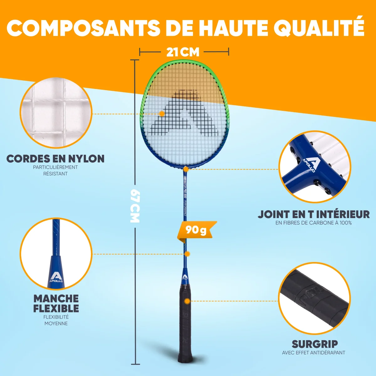 Le cadre des raquettes est composé d’un alliage de carbone et de graphite. Ces matériaux rendent la raquette à la fois très légère et de haute qualité. Cela vous garantit force et stabilité pendant le jeu. La rainure intérieure de la raquette est conçue pour protéger efficacement les cordes et réduire les dommages causés par le frottement contre le sol.