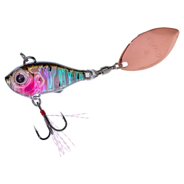 Ce spin tail GUNKI est sans plomb. L’alliage dans lequel il a été réalisé a permis de développer un leurre stable, qui « pousse de l’eau » et offre le signal d’une « belle proie », tout en supportant une palette qui émet des signaux puissants. Il décale les poissons de loin ! En récupération continue, Le SHOCKER VIB pêche à toutes les vitesses et sa palette reste attractive sur les phases de relâché. Pour les grosses perches, notamment en automne, faites-lui faire de petits bonds sur le fond agrémentés de pauses et soyez attentifs à la reprise de contact ! Les détails du SHOCKER VIB sont soignés: le signal œil est très présent, les proportions et les couleurs de la palette (de forme Indiana spécifique) s’harmonisent parfaitement avec le volume du corps que chaque leurre propose. L’hameçon triple est équipé d’un petit teaser pour favoriser le ciblage de l’attaque. Ces fibres seront un élément incitatif efficace, notamment quand les carnassiers le ramassent sur le fond. Parfait pour couvrir du terrain, le SHOCKER se lance loin, s’anime facilement et intéresse un grand nombre d’espèces de carnassiers. Pensé pour les perches, il se montre redoutable sur les aspes et les brochets. Il est fortement recommandé d’utiliser un petit bas de ligne qui résiste aux dents des brochets si vous souhaitez conserver vos SHOCKER VIB dans vos boîtes !