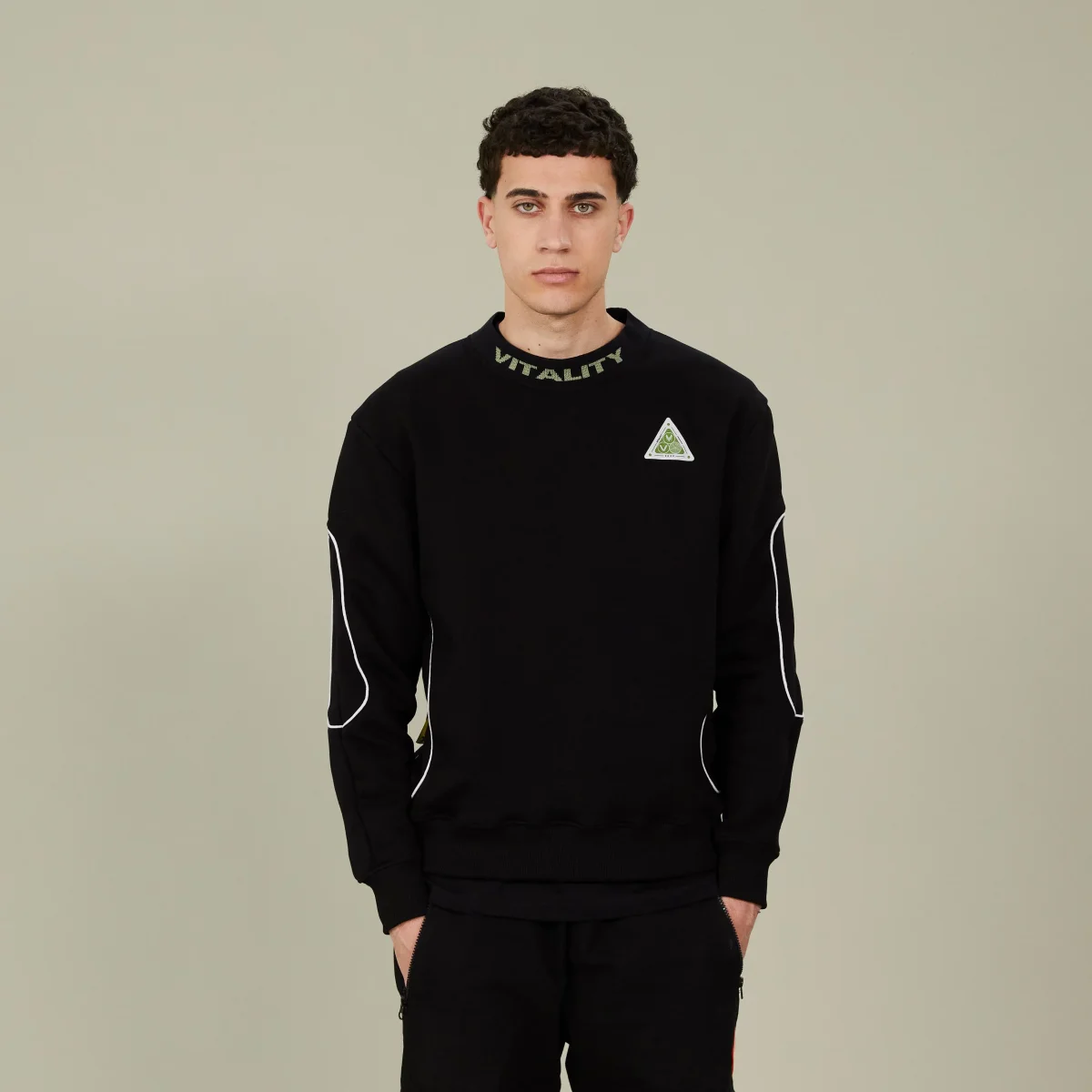 Ce sweat-shirt noir est l’alliance parfaite entre style et confort. Il se pare d’une encolure ronde contrastée par le logo vert Vitality et d’un imprimé en sérigraphie en forme de triangle arborant l’abeille et le V, détails emblématiques de la Team Vitality. Sa coupe hybride, sa matière coton et ses détails innovants t’assurent une allure cool et sportswear.