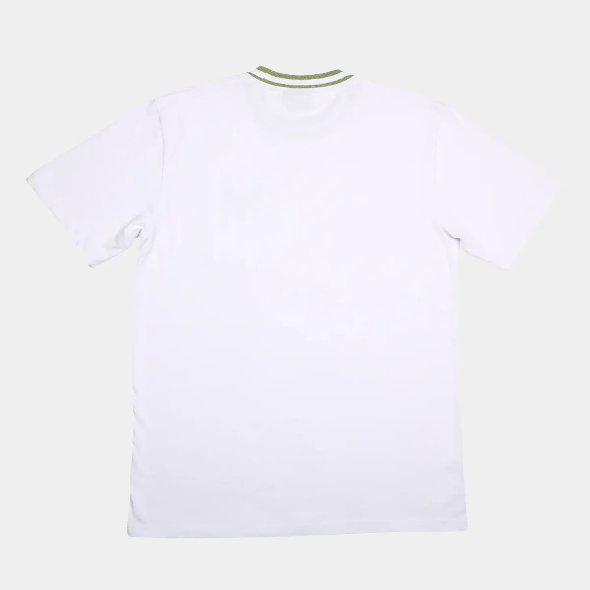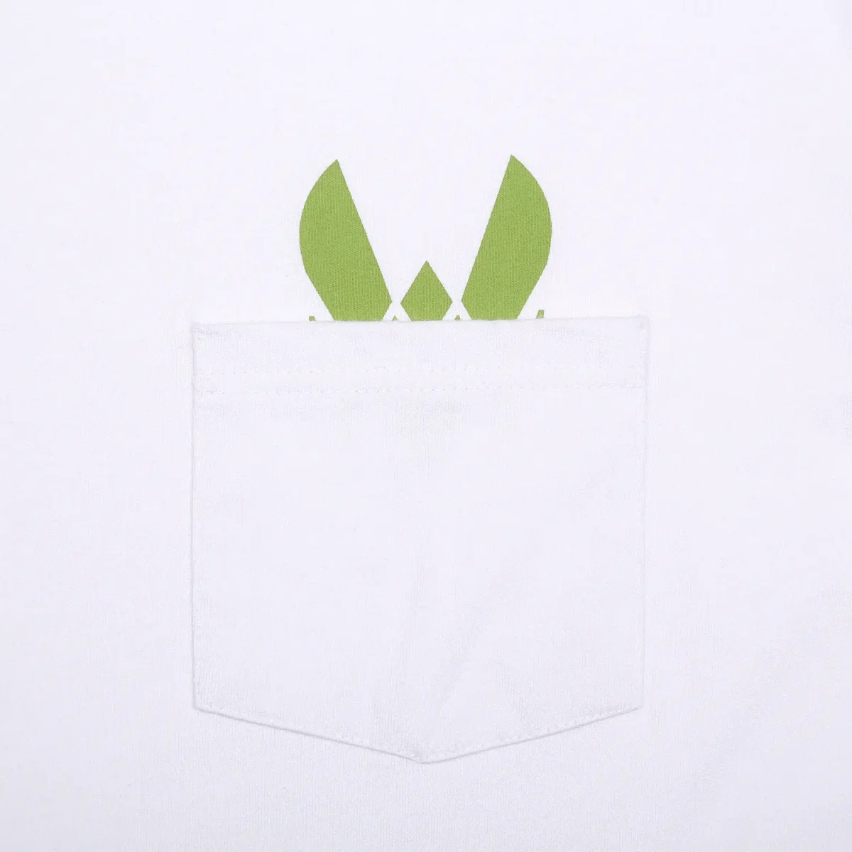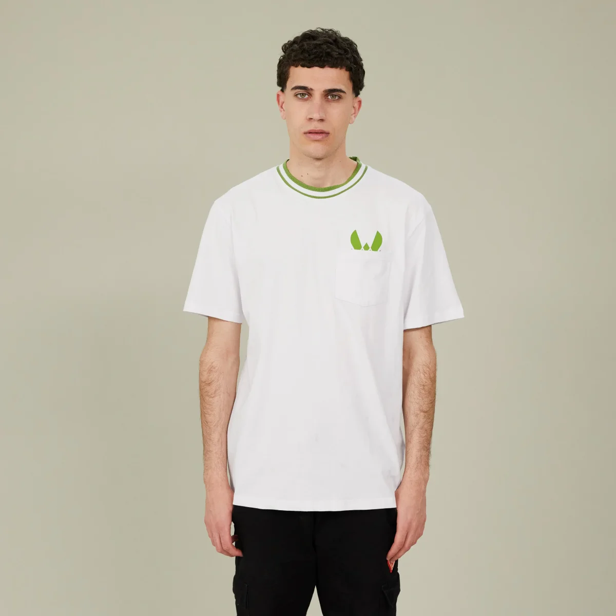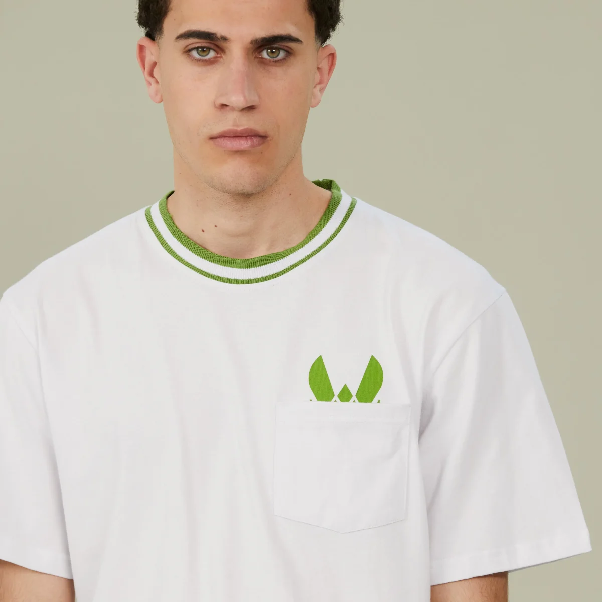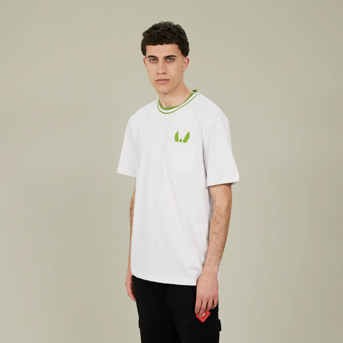 T-shirt Pocket : tee esports blanc 100 % coton, col rond à bandes vertes & poche logo abeille Team Vitality, style streetwear pro-gamer.