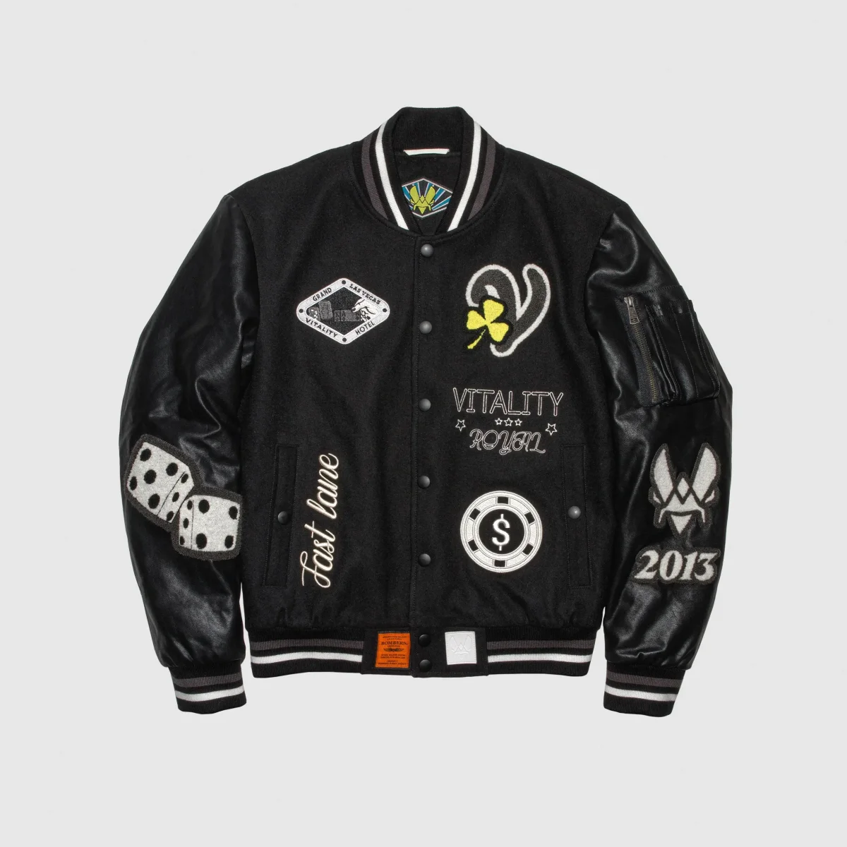 La veste Vegas de Team Vitality en collaboration avec Bombers Original est une pièce unique inspirée de l’atmosphère des casinos de Las Vegas. Avec son design noir et blanc, cette veste teddy oversize est une fusion parfaite entre le style streetwear et l’univers du jeu. Cette collaboration a permis de créer une veste de qualité supérieure conçue avec des matériaux résistants pour garantir une longue durée de vie.